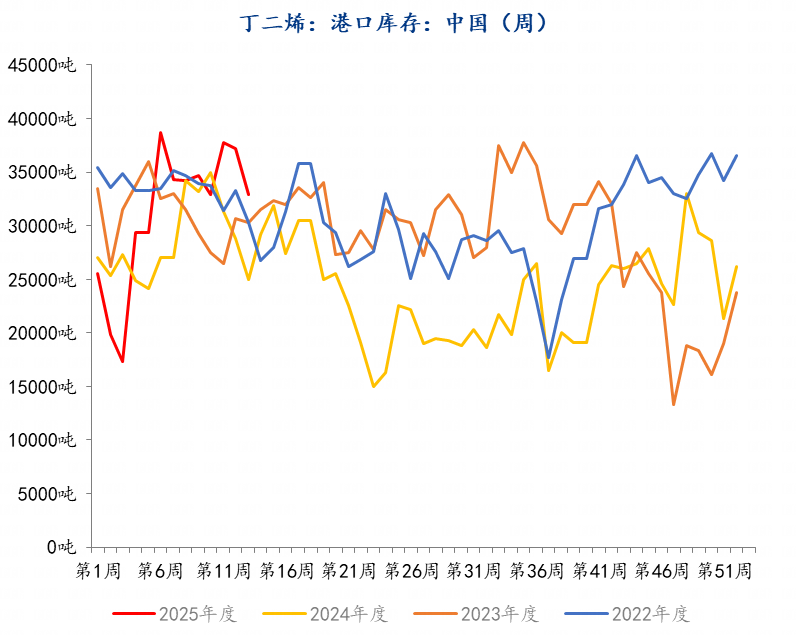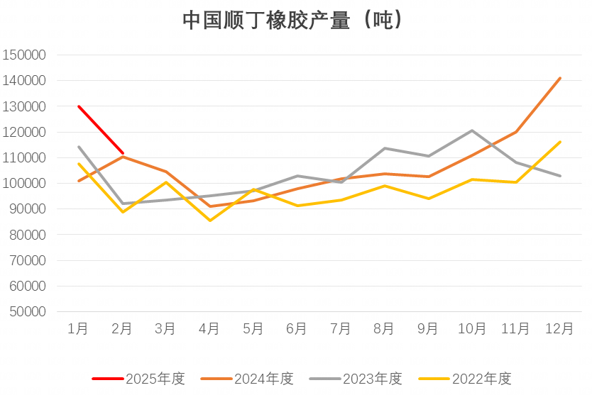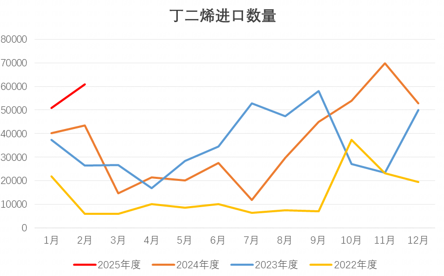 截至本周,丁二烯港口库存报32900吨,较上周减少4300吨,港口库存量下降明显。根据海关数据显示,丁二烯1月进口50870.081吨,2月进口60917.999吨,较往年同期大幅增加。春节前后,下游备货需求旺盛,港口供应偏紧,国际丁二烯价格较低,贸易商加大采购,导致到港船货增加。随着国内新产能释放和节后需求放缓,预计进口量可能下降。根据隆众资讯数据统计,2025 年中国丁二烯产能计划新增98 万吨,则2025 年中国丁二烯产能预计达767.7 万吨/年,同比增长14.6% 。整体来看,丁二烯原料产量充足且库存延续高位,供应难有明显利好,下游钢需压价采购,部分高价报盘亦成交不佳现象,预计国内市场仍延续弱势震荡。
