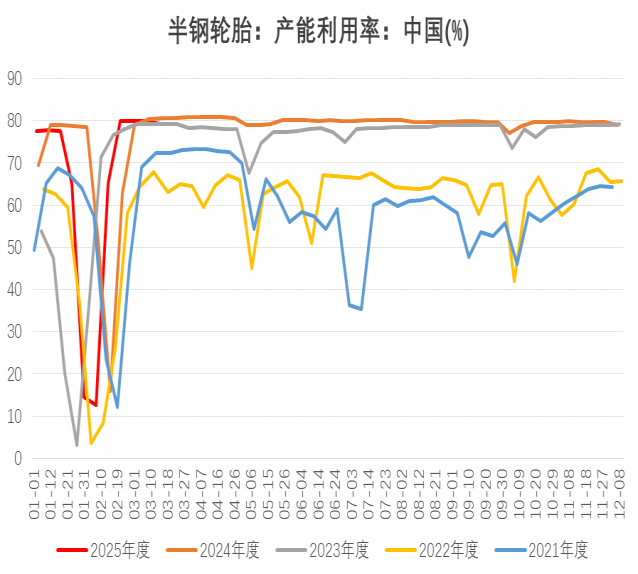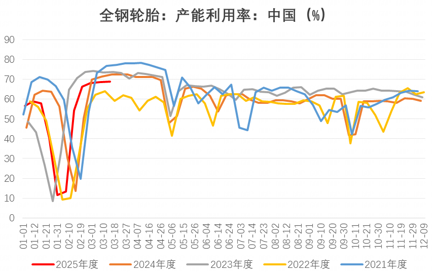 从国内汽车销量、轮胎企业产能利用等数据来看,中国汽车工业协会公布的数据显示,2025年1-2月,中国汽车产销分别完成455.26万辆和455.21万辆,同比分别增长16.26%和13.16%。其中,受春节假期消费及政策优惠影响,新能源汽车销量和出口数量均出现显著增长。2024年,伴随着以旧换新等相关政策效应的不断显现,加之各地企业的促销活动,半钢胎企业订单量充足,全年开工率维持高位,剔除春节假期等扰动因素,全年平均产能利用率在80%左右。截至3月29日,半钢轮胎企业产能利用率78.19%,环比下降1.08个百分点;全钢企业产能利用68.36%,环比下降0.54个百分点。受开工率影响,半钢胎样本企业整体库存高于去年同期水平,并呈现稳中有增,全钢胎样本企业整体库存则呈现季节性先降后增趋势。在轮胎技术创新以及成本优势、海外局势等多重因素影响下,中国轮胎出口量继续增加,1-2月中国累计出口119.83万吨,较上年同期115.64万吨增长了4.19万吨。虽然海外需求仍存一定韧性,但是加征关税的落地、范围和幅度仍存在变数,对轮胎出口造成一定的不确定性。