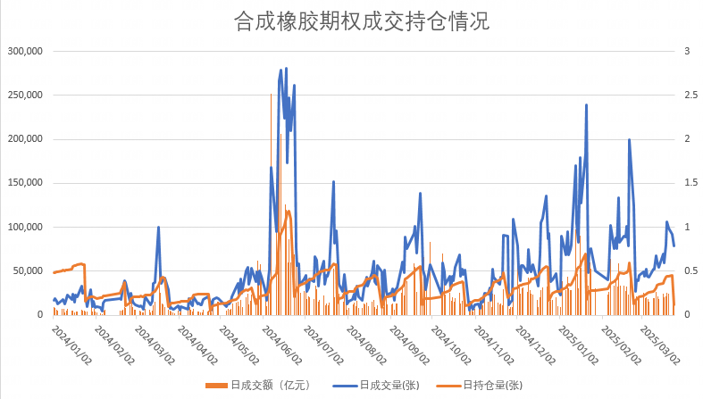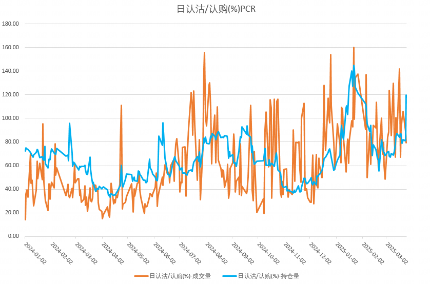 合成橡胶期权2025年1月成交量和持仓量显著增加,2月份成交量和持仓量持续回落,当前小幅攀升,一季度活跃度显著强于2024年一季度。从PCR指标来看,持仓量PCR(VL-PCR)1月持续上行至高位,2月回落,近期逐步上行,成交量PCR均值显著高于去年同期。从指标的意义来看,主力换月后指向看跌期权交易活跃,当前绝对数值约0.79显示看跌期权交易增加,期权持仓PCR值持续增加显示看跌倾向偏高。
