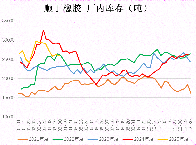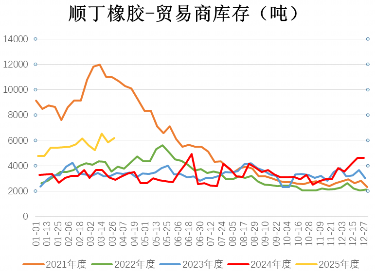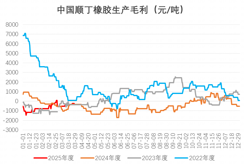 现货方面,1月受原料丁二烯大幅上涨影响,顺丁橡胶生产亏损一度跌至千元,多数企业出现降负及停车,叠合节前备货价格上涨预期,合成橡胶价格冲高整理。2月春节后下游采购不及预期,贸易商出货压力大,生产利润延续倒挂但窄幅缩短,现货价格先跌后弱势反弹。3月份下游终端采购仍较为消极,贸易商报盘虽试探溢价,但下游终端等跌压价心态明显,价格重心持续承压。