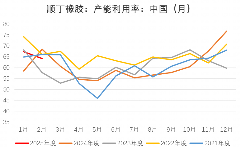 近一年来,顺丁橡胶和丁苯橡胶及丁二烯相关系数保持较高水平,与泰混20号胶相关性表现较弱。1月份和2月份受原料丁二烯价格影响,BR橡胶期货表现先强后弱。截至3月27日,山东丁二烯报价11050元/吨,较上周下跌100元/吨,环比下降0.89个百分点。一季度下游企业普遍亏损,中国高顺顺丁橡胶行业理论生产利润值最低到-1460元/吨,随后幅度缩窄至-233元/吨附近,进而导致产业开工率降低。2月份顺丁橡胶产能利用率为64.21%,环比下降3.18%,同比下降4.33%。