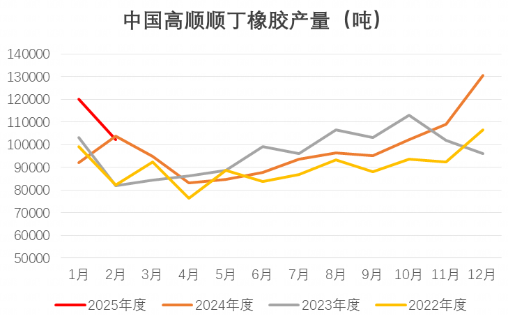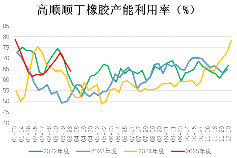 从库存数据上看,截至2025年3月28日,国内顺丁橡胶库存量为3.20万吨,较上周持平,仍处历史高位。其中,贸易商库存由年初的4760吨上涨至6180吨,厂内库存由年初的26500吨增至29700吨,后一路下降至25900吨。华东部分顺丁橡胶装置临时停车,市场观望情绪较重,考虑到开单成本及高价库存,贸易商试探挺价但交投一般,生产企业库存和贸易商库存基本稳定。截至3月27日,以齐鲁石化顺丁橡胶为例,其出厂价格在13700元/吨,推算成本在13933元/吨,理论生产利润为-233元/吨。顺丁橡胶生产利润宽幅亏损局面缓解后,带动前期停车、降负装置负荷提升,产能利用率有效提升。