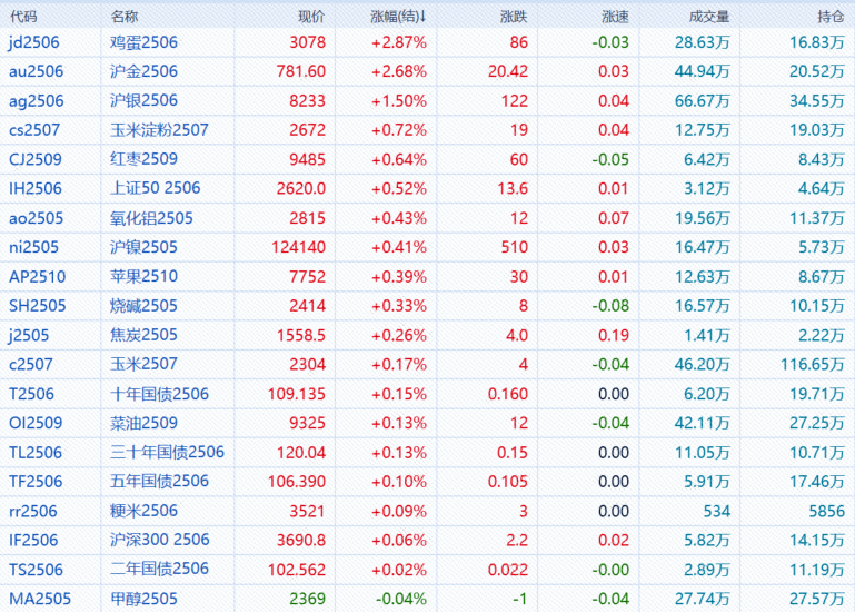 4月16日,午盘收盘,国内期货主力合约跌多涨少。鸡蛋、沪金涨超2.5%,沪银涨超1%。跌幅方面,集运欧线跌超6%,BR橡胶、菜粕跌超4%,豆二跌超3%,20号胶、PTA跌近3%。