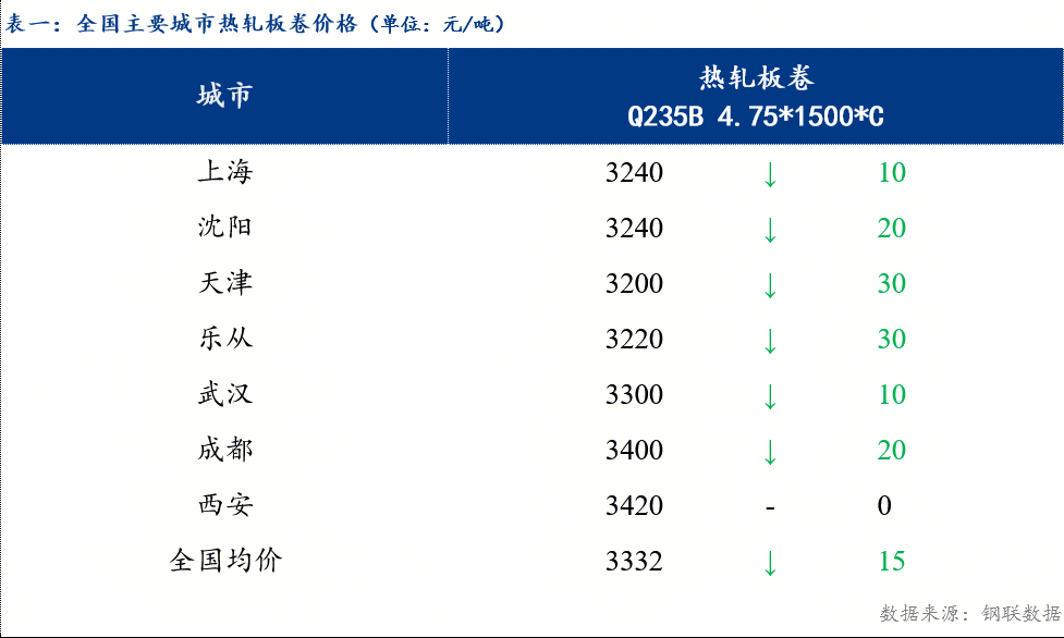 今日热轧板卷全国主要城市价格小幅下跌,截止发稿时3.0mm热轧板卷全国均价3369元/吨,较上个交易日下跌26元/吨。4.75mm热轧板卷全国均价3314元/吨,较上个交易日下跌26元/吨。今日黑色商品期货震荡下行,热卷10合约收跌1.05%,早盘现货价格弱稳运行,市场情绪较为谨慎,成交一般;午后期货跳水,价格下跌,整体成交偏弱。
