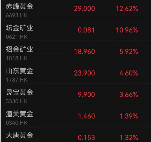 港股方面,赤峰黄金涨超12%,坛金矿业涨超10%,招金矿业、山东黄金大涨。