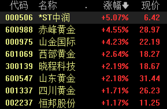 市场上,黄金股逆势走强。A股方面,*ST中润涨停,赤峰黄金、山金国际涨超4%。