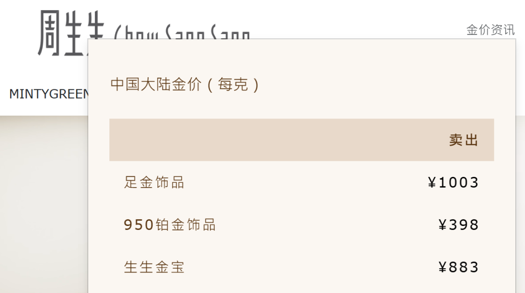 金饰价格方面,多家知名金饰品牌金价均已超过1000元/克大关,今日周生生足金饰品为1003元/克;周大福足金(饰品、工艺品类)为1006元/克;老庙黄金足金饰品为1003元/克。
