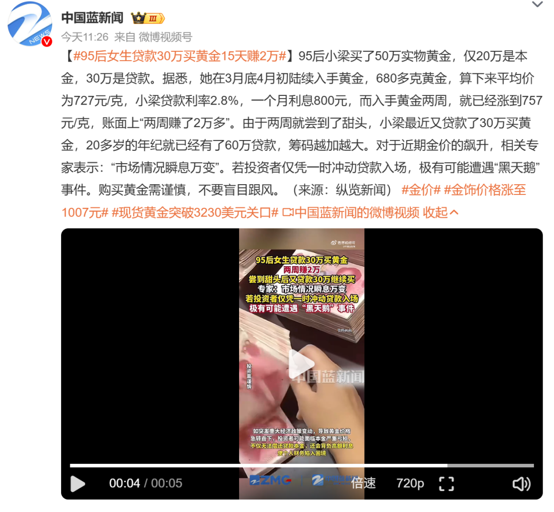 值得注意的是,4月15日,一则#95后女生贷款30万买黄金15天赚2万#的话题引发关注。