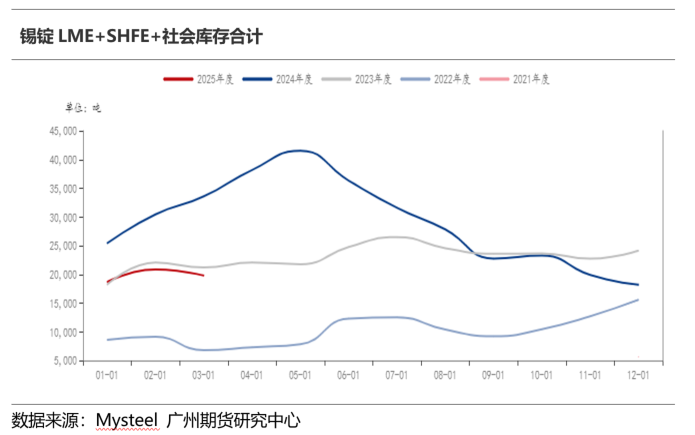 由于印尼1月锡锭出口季节性低点,LME锡锭库存持续去化至中性偏低位水平,国内锡锭库存在高价对需求有所抑制背景下保持累增态势,但内外整体库存水平处于偏中位置。目前锡锭LME+SHEF+社会库存合计为19515吨,较去年同期的合计量30455吨,减少10940吨,或35.9%。预计在缅甸佤邦、刚果(金)和印尼的锡供给显著恢复前,内外锡库存较难有明显累增压力。