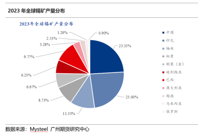 中国锡精矿40%左右依赖于进口,缅甸为主要进口国。2023年4月15日,佤邦中央经济委员会发布文件称,为了保护剩余的矿产资源,2023年8月1日后矿山停止一切勘探、开采、加工等作业。直至今日曼相矿区仍未复产,缅甸是世界第三大锡资源国,缅甸锡矿资源主要集中在佤邦地区,该地区供应量一度占到缅甸总供应的90%,佤邦的锡矿资源分布在曼相和邦阳两大成矿区,而曼相是最主要的锡矿区,该地区的锡矿几乎全部以边境贸易的形式出口至中国。
