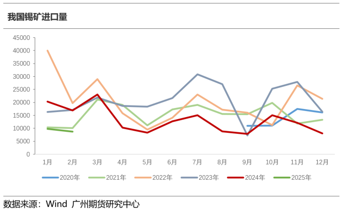 今年3月13日,位于刚果(金)的全球第三大锡矿Bisie矿山的运营商Alphamin Resources宣布,因当地的叛乱武装组织近期向矿区所在地方向推进,已暂时停止矿山的运营,这也对锡矿供给端造成一定影响。Bisie是全球第三大锡矿,也是刚果(金)最主要的锡矿来源,2024年锡精矿产量达17,300吨,占全球锡矿供应量的约6%。根据海关数据公布2024年我国从刚果(金)进口锡矿占总进口的约21.5%,仅次于缅甸的48.1%。值得注意的是,2023年时,我国从刚果(金)进口锡矿占比还仅仅是11.1%,而从缅甸进口则达到了72.5%。两方对比之下,刚果(金)在2024年作为我国进口锡矿来源国的地位显得更为突出。市场预计若Bisie矿停产到今年底,今年或减少约1.4万吨锡供应量。
