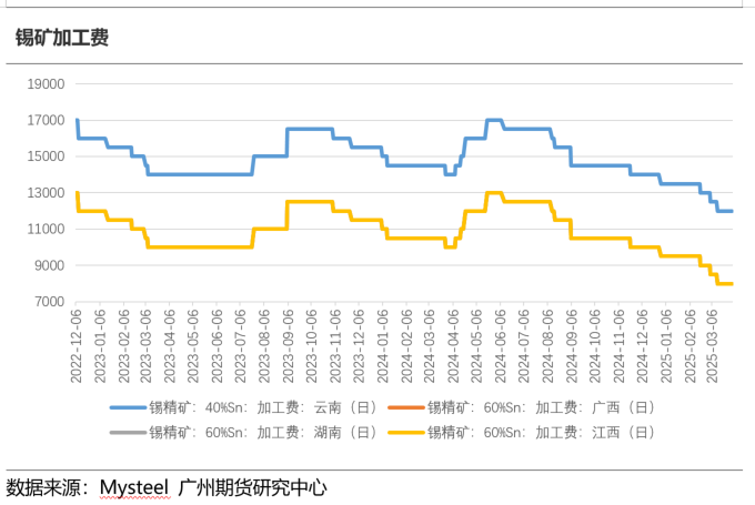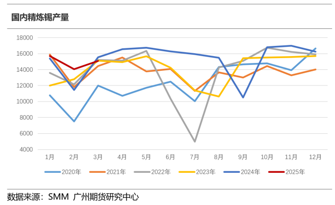 2024年6月末以来,国内锡精矿加工费持续下滑。截至2025年4月1日,云南地区40%锡精矿加工费下滑至12000元/吨,较2024年6月最高点下跌29.4%;湖南、江西、广西60%锡精矿加工费均下滑至8000元/吨,较2024年6月最高点下跌38.5%。随着原料供应趋紧,部分炼厂有意收缩产量,同比增速正在放缓,2025年3月中国精炼锡产量为1.5万吨,同比减少3.1%,预计接下来的几个月国内精炼锡产量将继续收缩。
