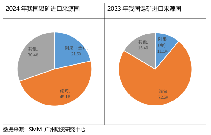 受缅甸佤邦禁矿的影响,中国2024年锡矿进口量大幅降低。根据海关数据,2024年全年中国累计进口锡矿15.86万吨,累计同比减少36%,缅甸锡矿在我国锡矿进口中的占比已由2024年前的80%以上大幅下跌至不足50%。在此期间,进口自刚果(金)、澳大利亚的锡矿量有所增加,但在体量上不足以弥补缅甸矿的减量。