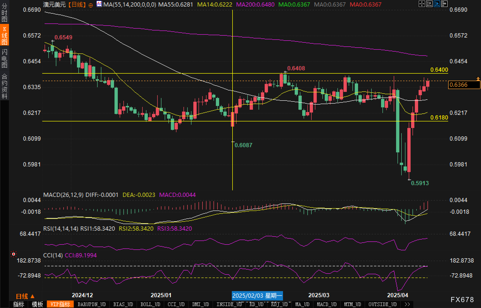 从日线图分析,澳元/美元经历了一个完整的V型反转形态,从低点0.5913强势反弹。目前汇价正挑战0.6400重要阻力位,该关口的突破与否具有重要意义。MACD日线指标DIFF(-0.0001)即将突破零轴,DEA(-0.0023)虽仍为负,但金叉的形成展现了多头动能。RSI(58.3420)位于中性偏强区域,暗示中期上行动能尚未衰竭。值得关注的是,日线CCI(89.1994)处于高位,如突破100将进入超买区域,或引来短期回调风险。