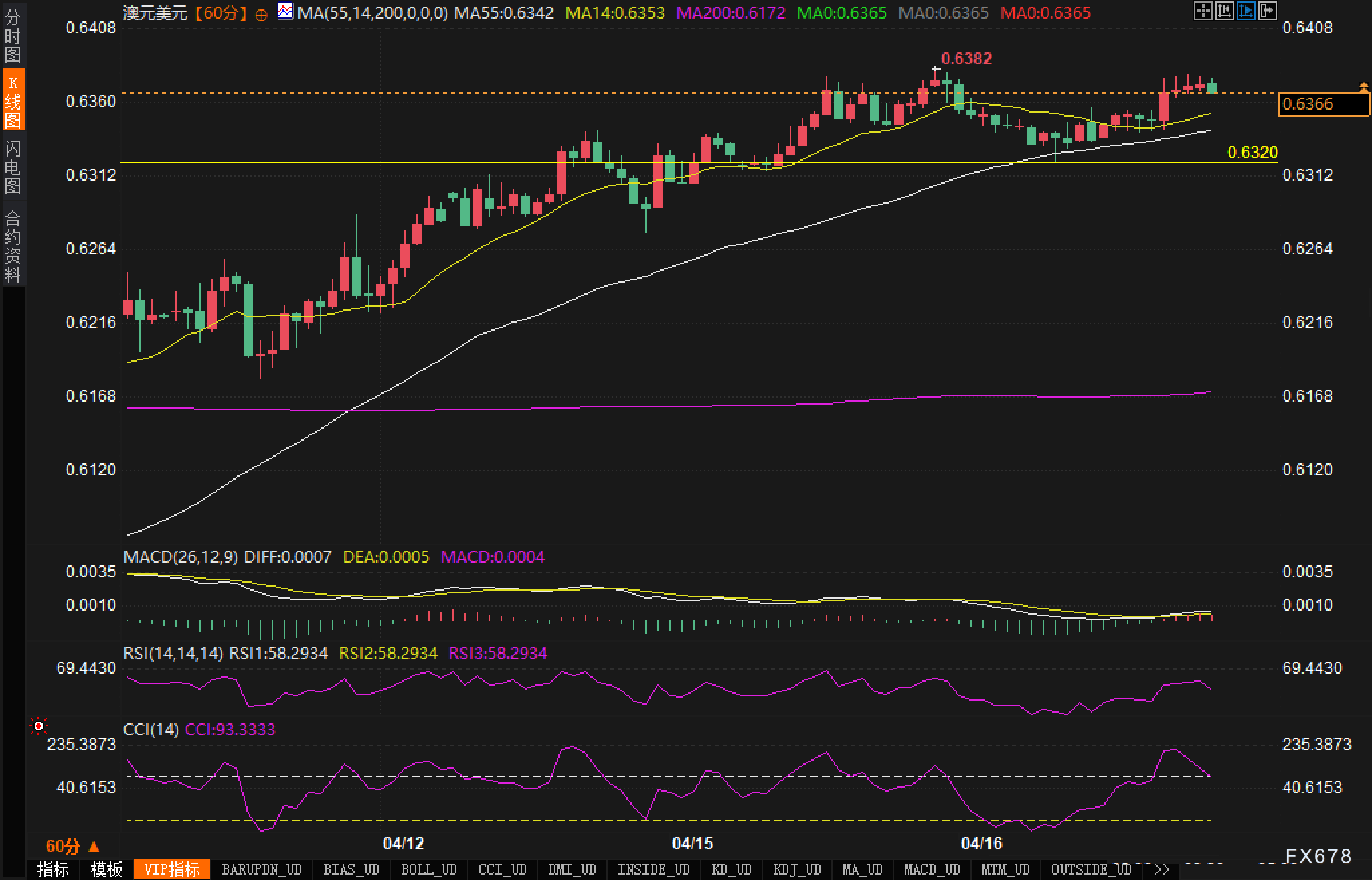 从60分钟图来看,澳元/美元汇价呈现明显的上升通道形态。汇价目前稳定在0.6370阻力位附近,短期支撑位于0.6320水平。移动平均线系统呈现多头排列,其中MA14(0.6353)和MA55(0.6342)向上发散,为汇价提供动能支撑。MACD指标显示DIFF(0.0007)和DEA(0.0005)均位于零轴上方,且柱状图保持正值,表明短线动能仍偏向多方。值得注意的是,RSI(58.2934)处于中性偏强区域,尚未进入超买状态,预示上行空间仍存。CCI(93.3333)虽已进入高位区,但未形成顶部背离,短期调整风险有限。