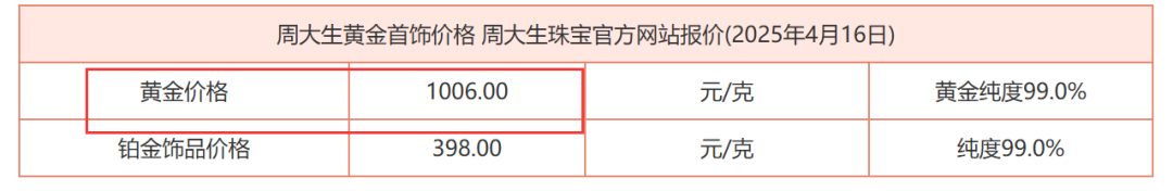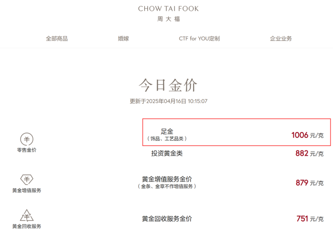 与此同时,国内品牌金饰的足金金价也正式进入“千元时代”,周大福、金至尊、周大生等珠宝品牌的足金金价已突破1000元/克。