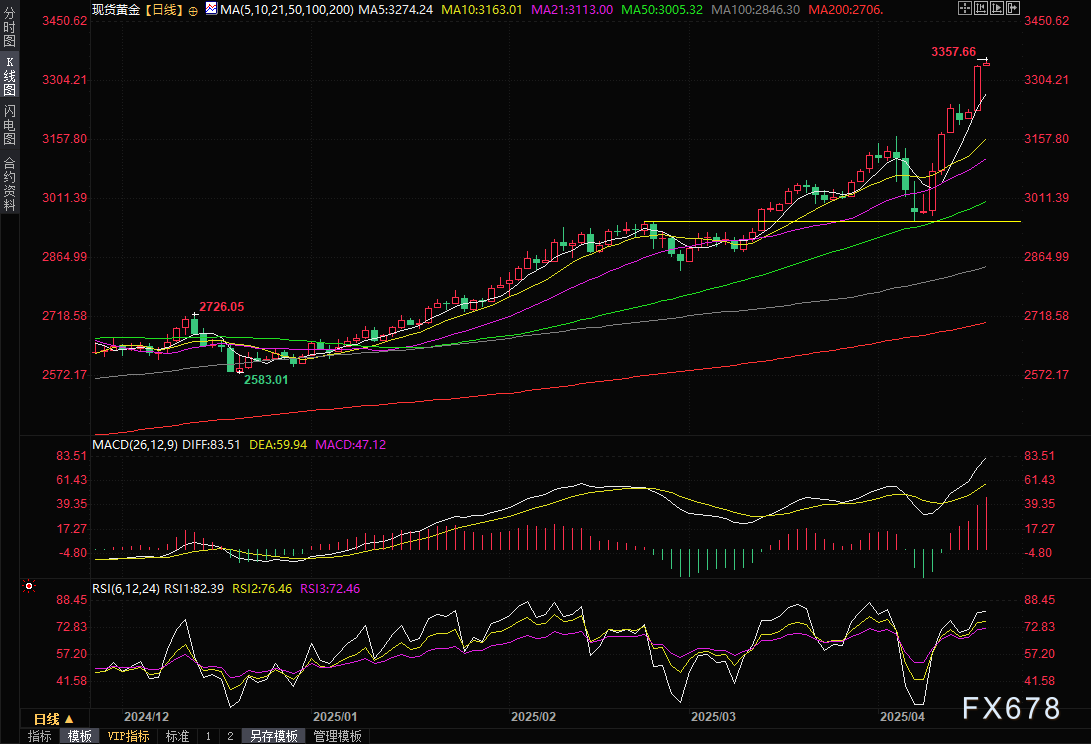 汇通财经APP讯——周四(4月17日)亚市早盘,现货黄金小幅冲高,一度刷新历史高点至3357.66美元/盎司附近。金价周三大涨逾100美元,升破3300关口,最高触及3342.95美元/盎司,涨幅约3.52%,国际贸易紧张局势升级,促使投资者转向避险资产,美联储主席承认经济增长放缓,美股、美元和美债收益率大跌,也给金价提供上涨动能。