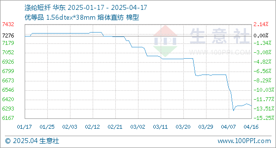 4月17日,生意社涤纶短纤基准价为6334.67元/吨,与本月初(6749.00元/吨)相比,下降了-6.14%。