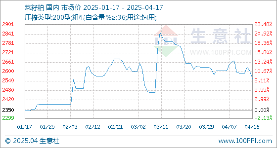 4月17日,生意社菜籽粕基准价为2555.00元/吨,与本月初(2616.67元/吨)相比,下降了-2.36%。