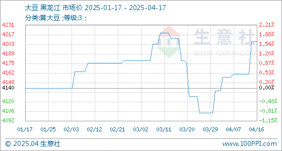 4月17日,生意社大豆基准价为4208.00元/吨,与本月初(4136.00元/吨)相比,上涨了1.74%。
