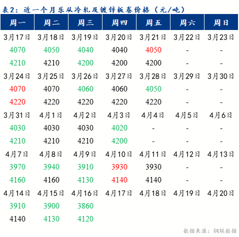 截止2025年4月16日17:30,冷轧板卷月均价为4001元/吨,镀锌板卷月均价为4185元/吨。