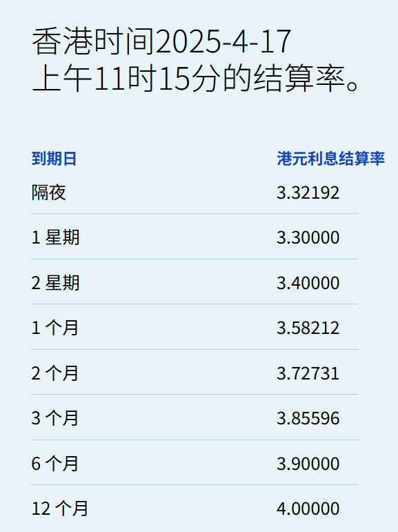 复活节长假期前,港元拆息个别发展,其中,隔夜息上升约22基点至3.32192%,为3月31日以来最高,而与楼按相关的一个月拆息则连跌三天,报3.58212%,见近一周新低。