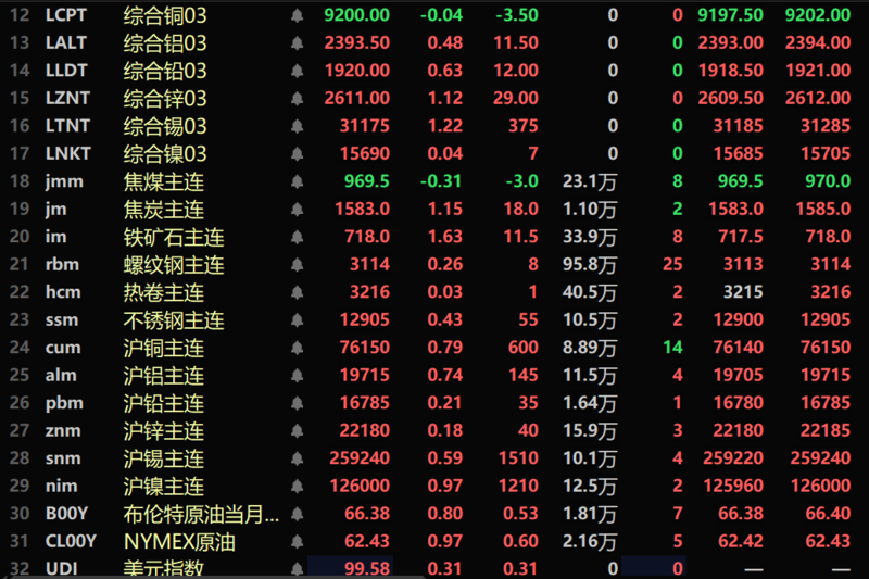 截至午间收盘,内盘基本金属全线上涨,沪铜涨0.79%。沪锡涨0.59%,沪镍涨0.97%。沪铝涨0.74%,沪铅涨0.21%,沪锌涨0.18%。