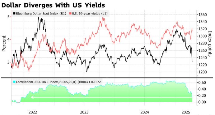 4月份迄今,美元兑其他六种主要货币的汇率指数下跌了4%,这将是自2022年以来最糟糕的月度表现。与此同时,美国长期债券收益率仍接近17个月高点。通常,较高的债券收益率对美元有利。但这一次,随着越来越多的投资者质疑美元的避险地位和在全球金融体系中的核心作用,两者之间传统的正相关水平为三年来最弱。