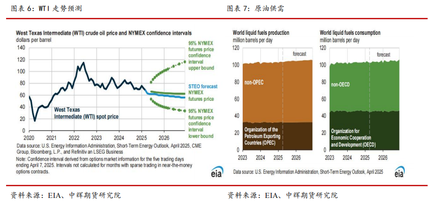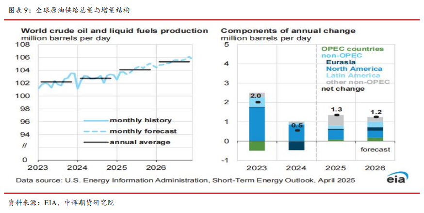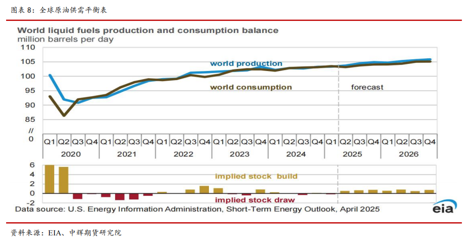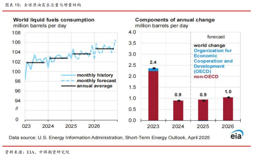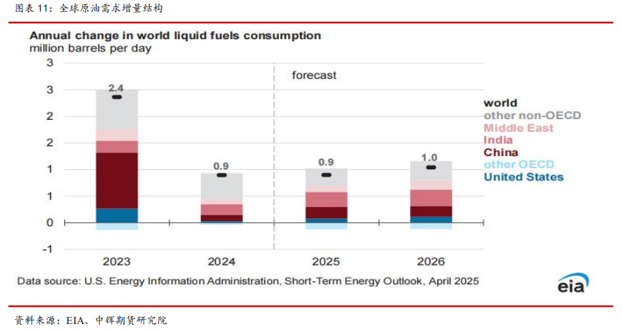 EIA 最新 4 月报预计,2025 年全球原油供给增量为 130 万桶/日,非OPEC+地区贡献 120 万桶/日,2026 年供给增量为 120 万桶/日,非 OPEC+地区贡献 70 万桶/日。预计 2025 年需求增量为 90 万桶/日,2026 年需求增量为100 万桶/日,其中增量主要来自 OECD 之外的发展中国家,印度和中国二者将是增量主要来源,印度增量约 30 万桶/日,中国增量约 20 万桶/日。
