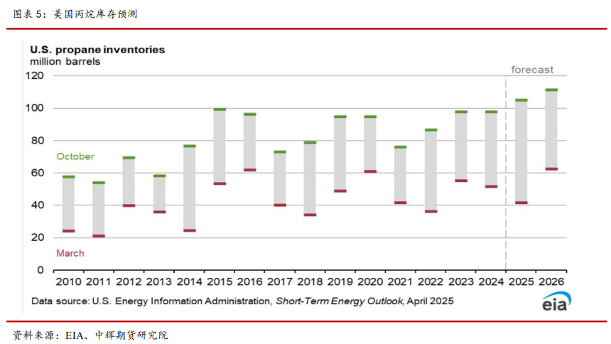 关税政策将会对美国丙烷市场产生较大影响。2024 年中国丙烷进口来源国中,美国占比 32%,伊朗 17%,卡塔尔 7%,阿联酋 3%。后续,美国出口至中国的丙烷将转向其它地区,预计美湾地区丙烷库存将会显著上升,美国丙烷现货价格预计 2025 年均价为 0.76 美元/加仑,2026 年均价为 0.52美元/加仑。尽管丙烷价格下降,但鉴于美国页岩油仍有开采利润,丙烷产量预计还会上升,丙烷库存从 4 月开始至 10 月将持续累库,库存将会升至6000 万桶至 6500 万桶,较往年 4000 万桶至 5000 万桶库存量显著上升。