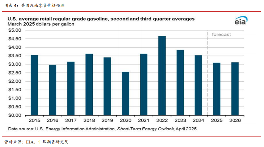 全球原油市场—美国石化产品。预计 2025 年夏季美国汽油零售价为3.10 美元/加仑,2026 年夏季为 3.20 美元/加仑,在原油价格下降带动下,2025 年汽油零售价将是 2020 年以来首次跌破 3.50 美元/加仑。
