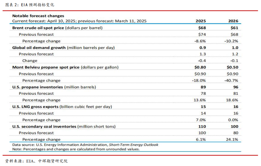 EIA 最新 4 月报预计,在关税扰动下,下调 2025 年和 2026 年全球原油需求增量至 90 万桶/日、100 万桶/日。EIA 预计,全球原油库存将从 2025 年2 季度开始累库,早于上个月预测的下半年开始累库,主要原因是关税政策导致宏观经济前景偏悲观,原油需求增量不足,叠加 OPEC+扩产,库存将会持续累库至 2026 年。在累库情况下,EIA 预计 2025 年 Brent 均价为为 68 美元/桶,2026 年均价为 61 美元/桶,较 3 月份分别下调 6 美元/桶、7 美元/桶。