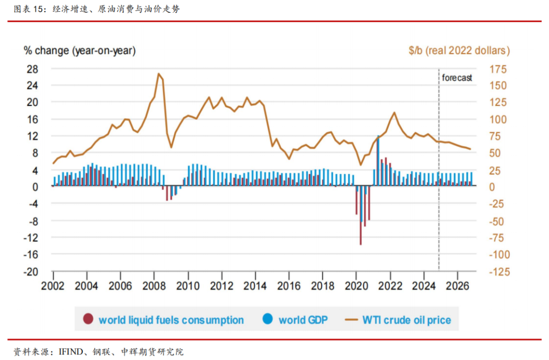2025 年 4 月,特朗普挑起全球关税战争,在高关税下,贸易进出口受损,市场对全球宏观经济相对悲观。宏观经济是影响原油需求和油价的重要因素。油价走势一般和经济增速一致,一般经济增速要高于原油需求增速,在油价较低时,经济增长对需求拉动效应比较明显,需求增速约经济增速1/3 到 1/2。油价较高,高于 90 美元/桶,将会产生负反馈,经济增长对需求拉动减弱。