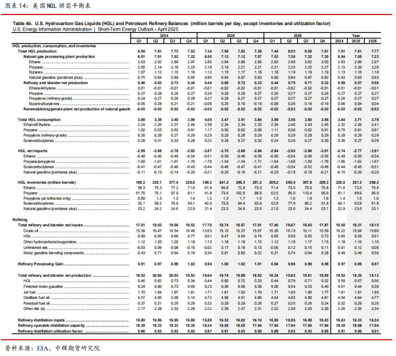 美国石油供需平衡表。预计 2025 年美国原油产量 1351 万桶/日,原油净进口量为 195 万桶/日,NGL 产量为 705 万桶/日,环比增加 11 万桶/日。日均消费量为 2038 万桶/日,其中汽油消费最高为 890 万桶/日。