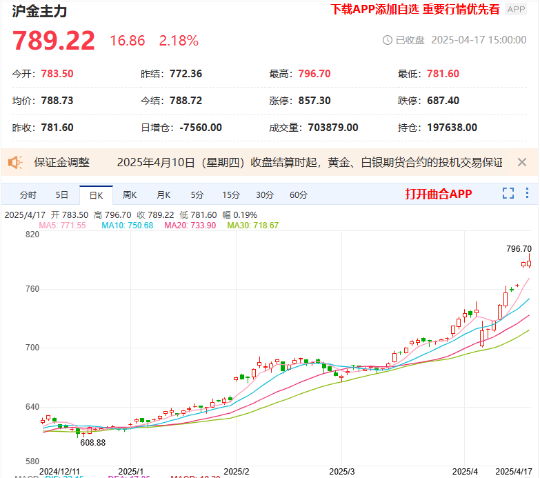 日内收盘,沪金上涨2.18%,报收789.22元/克,盘中再次刷新,距800整数位仅一步之遥。