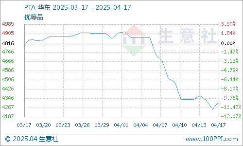 据生意社商品行情分析系统,4月以来国内PTA现货市场呈现明显弱势,截止4月17日华东地区市场均价在4318元/吨,较月初下跌12.04%。