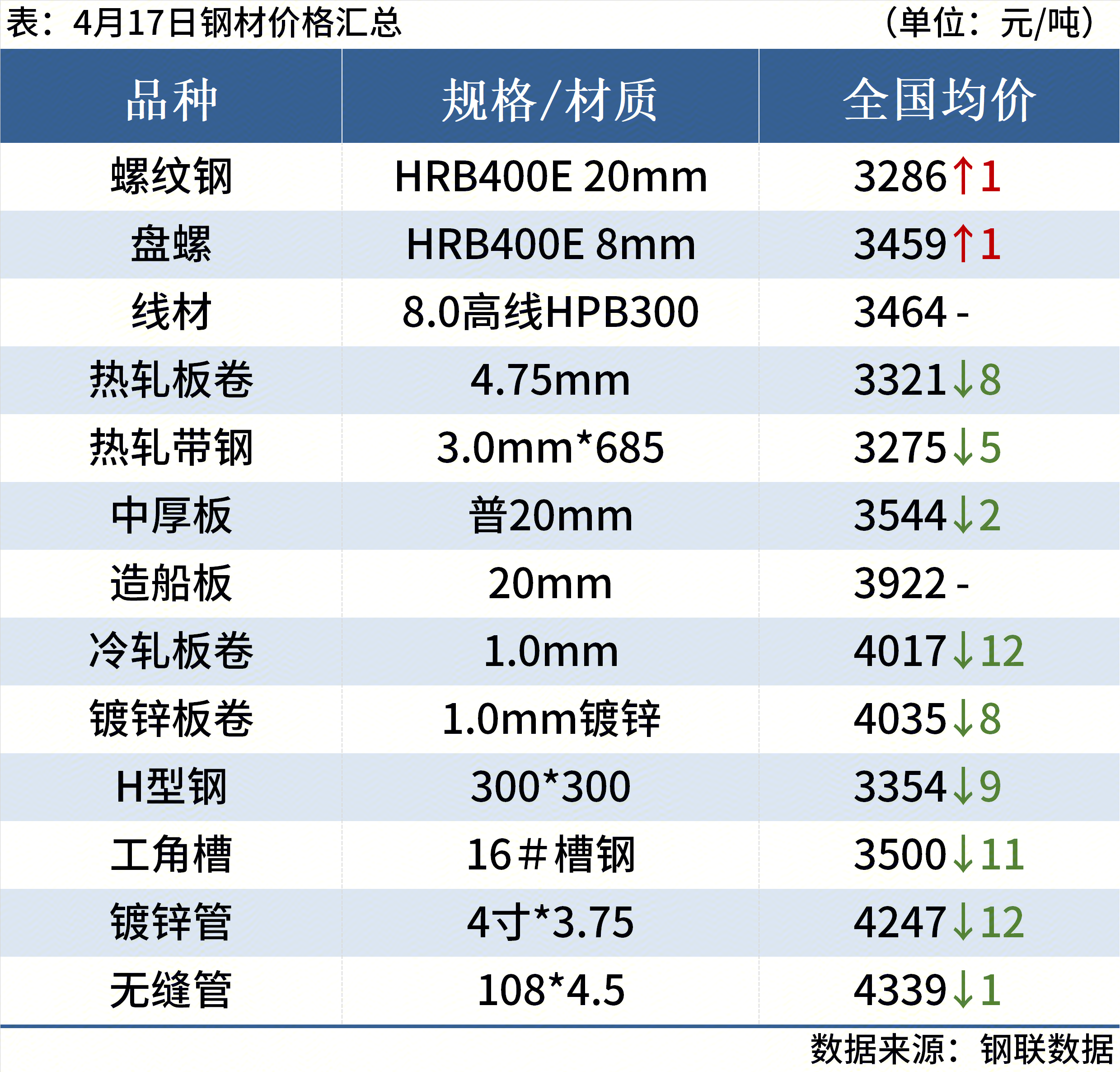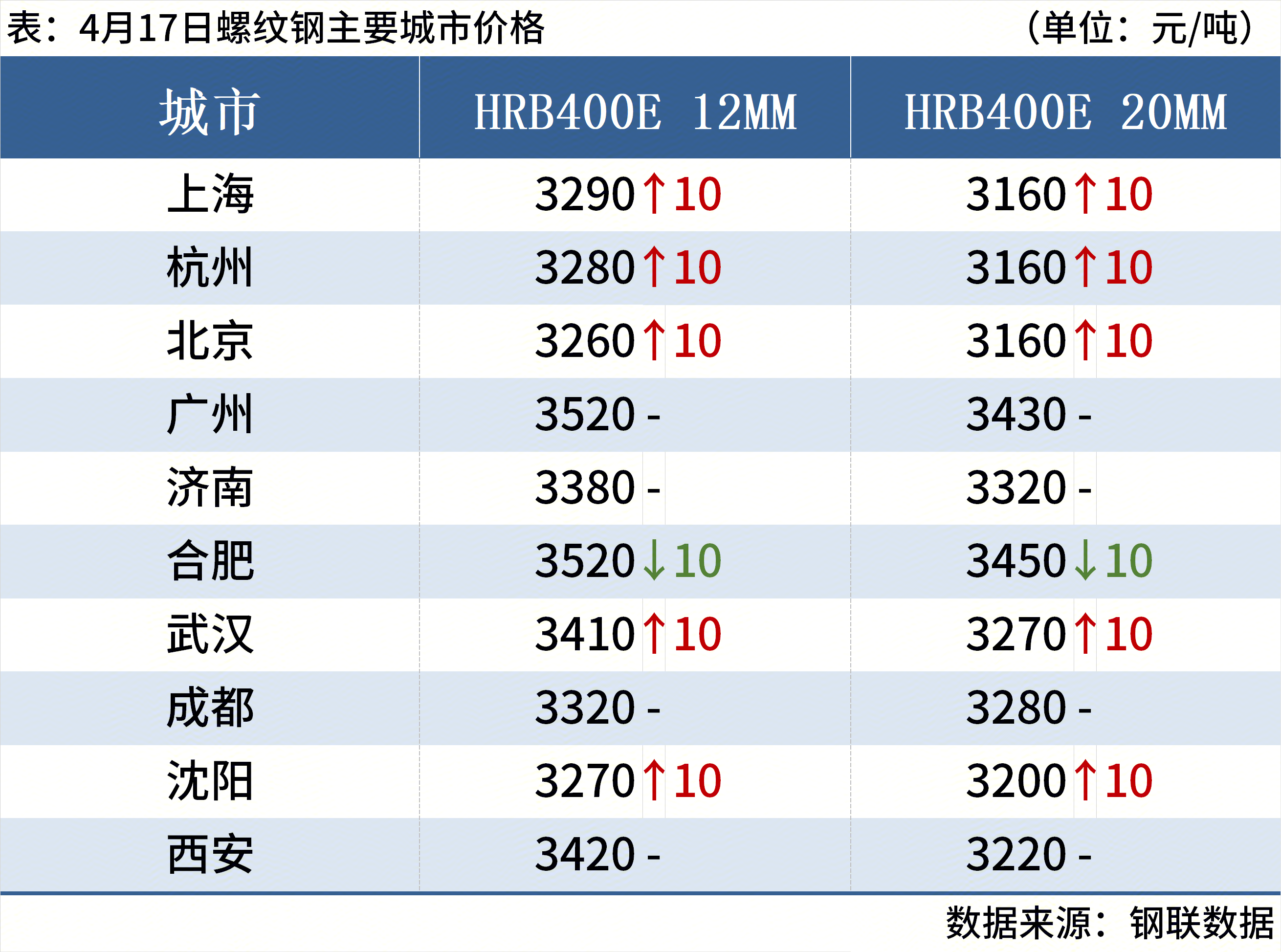 4月17日,国内钢材市场窄幅调整,唐山迁安普方坯资源出厂含税涨10报2950元/吨。17日期螺冲高回落,市场心态表现不佳,刚需采购情绪一般。