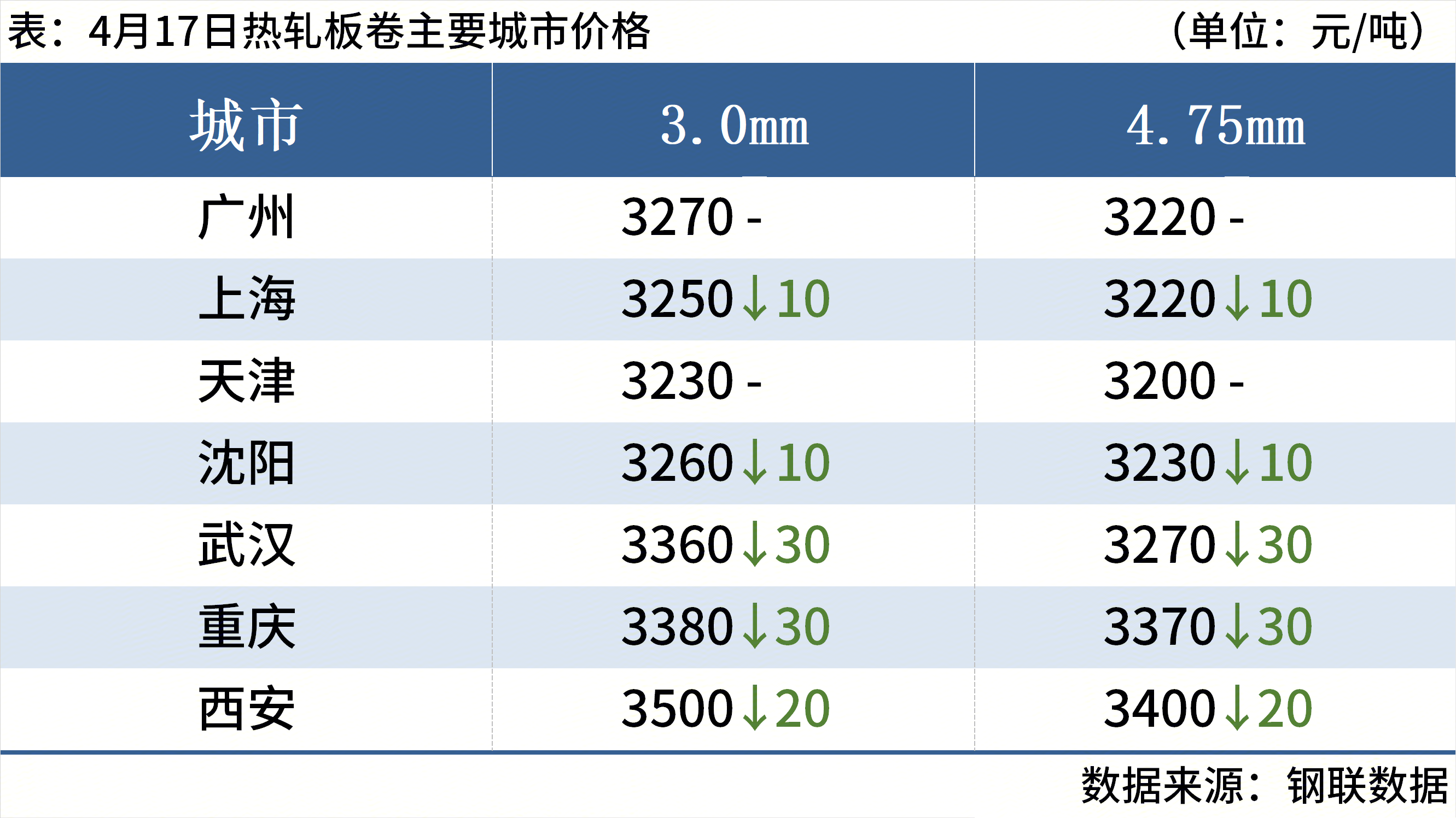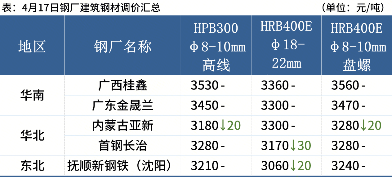 4月17日,国内3家钢厂下调建筑钢材出厂价20-30元/吨。