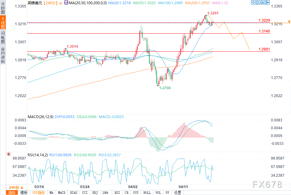 4小时图上,英镑/美元汇率最近完成了一波上涨行情,在接近1.3290的位置见顶。