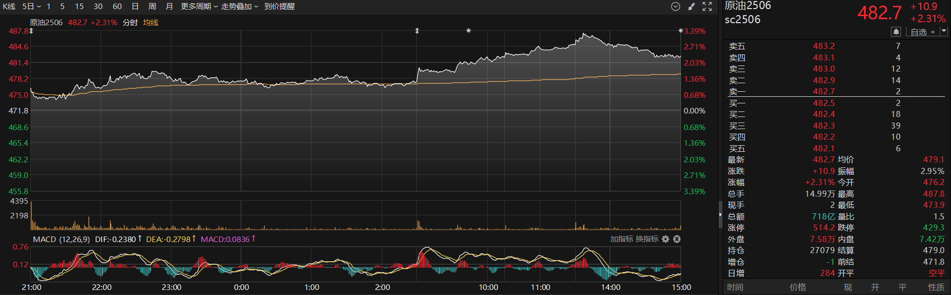 4月17日,国内商品期货涨跌不一,原油期货震荡偏强。截至下午收盘,原油期货2506合约上涨2.31%,报482.7元/桶。