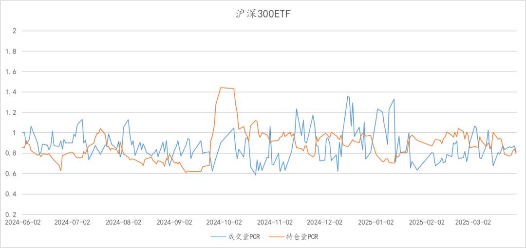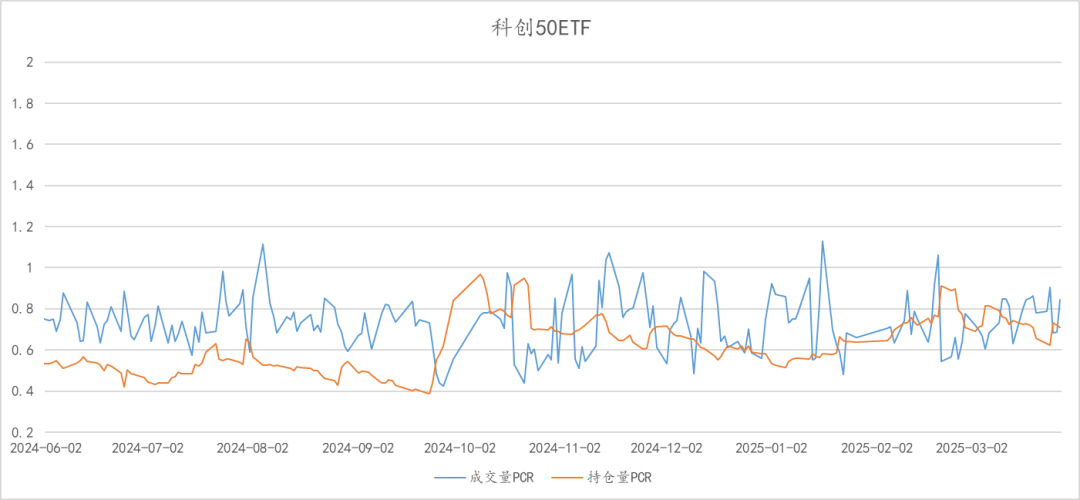 持仓量PCR指标是个趋势型指标,通常更能显示行情走势变化。从持仓量走势上来看,可以发现通常会跟随市场行情涨跌而涨跌,在一月初,市场下跌,PCR指标也是跟随下跌,背后的逻辑在于认购期权买方会进行补仓,而认沽期权买方习惯于落袋为安,从而导致认购持仓量增加,认沽持仓量减少,所以持仓量PCR会快速下降。而在2月下旬的大涨行情中,持仓量PCR指标快速上升,认沽期权买方亏损后补仓,认购期权买方会落袋为安,比如科创50ETF,由于1.1元关键压力位被突破,卖出认购的机构投资者也要平仓止损,从而导致认购持仓量减少,进而导致PCR指标上升。到了3月份,标的整体呈现回调走势,认购期权持仓有所增大,所以PCR指标在3月份不断走低下降。