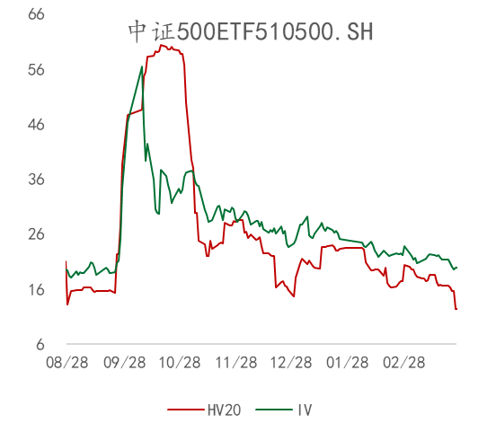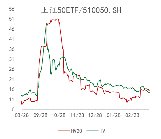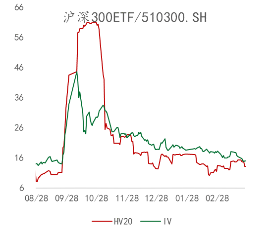 ETF期权标的波动率在一季度整体呈现下降趋势。去年10月初波动率来到高点之后,整体呈现降波走势,虽然波动率目前回落较大,但是和历史波动率对比后可以发现,还有回落的空间,尤其是科创50ETF,在2月份走势偏强的情况下,波动率反弹的更加明显,我们在2月份的月报中也是提到了波动率或将继续回落。