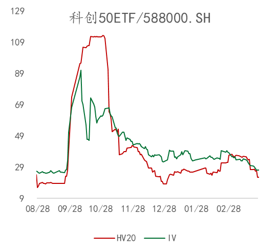 2月底,科创50ETF升波的原因主要在于2月21日大涨,科创50ETF一天突破1.1元和1.15元压力位,波动率出现了一波拉升,不过升波是短暂的,随着科创50ETF在1.2元的位置遇阻回落后,波动率也是一路的走低。