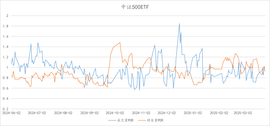 2025年1-3月,上证50ETF,沪深300ETF,中证500ETF和科创50ETF期权成交量PCR指标大概波动范围在(0.6,1.3)、(0.6,1.4)、(0.7,1.4)和(0.4,1.4),因为成交量PCR指标是短线情绪衡量指标,当PCR指标上涨时,说明认沽成交量高于认购,市场往往会博弈跌还是不跌,而当PCR指标下降时,说明认购成交量高于认沽,市场往往博弈涨还是不涨。比如在2月份科创这波大涨行情中,成交量PCR指标快速上升,市场更多的在博弈跌还是不跌。成交量PCR指标作为短线情绪指标,并不能能够代表行情趋势走势。成交量PCR同时也呈现出波动幅度越来越窄走势。当行情波动相对平稳之后,尤其是市场成交量回落,期权的成交也会逐渐降低,从而导致PCR指标波动幅度降低。