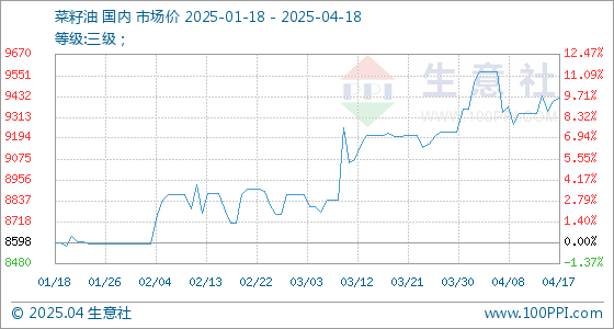 4月18日生意社菜籽油基准价为9423.33元/吨