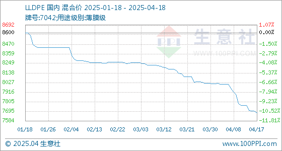 4月18日,生意社LLDPE基准价为7676.67元/吨,与本月初(8011.67元/吨)相比,下降了-4.18%。