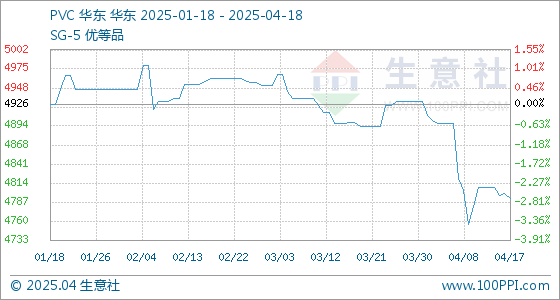 4月18日,生意社PVC基准价为4792.00元/吨,与本月初(4930.00元/吨)相比,下降了-2.80%。