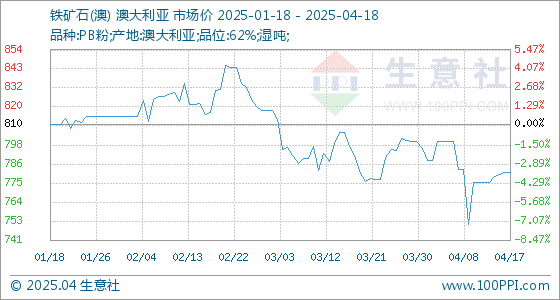 4月18日生意社铁矿石(澳)基准价为781.89元/吨