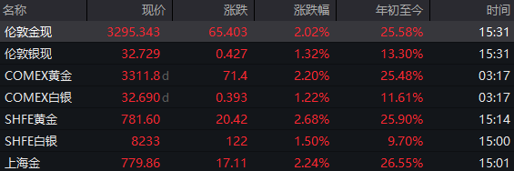 截至15:31,现货黄金价格报3295.34美元/盎司,日内涨幅达到2.02%,年初以来累计涨幅达到25.58%;COMEX黄金期货上涨2.20%,报3311.8美元/盎司,年初以来累计上涨25.48%。