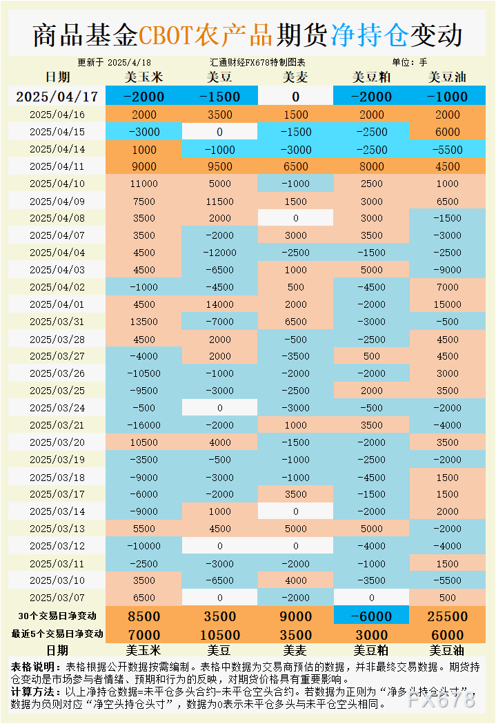 随着节后市场重新开盘,天气演变、播种进度与新一轮国际采购将成为主导CBOT谷物走势的核心变量。基金持仓若能止跌回稳,或预示二季度初期市场重新走强的可能。